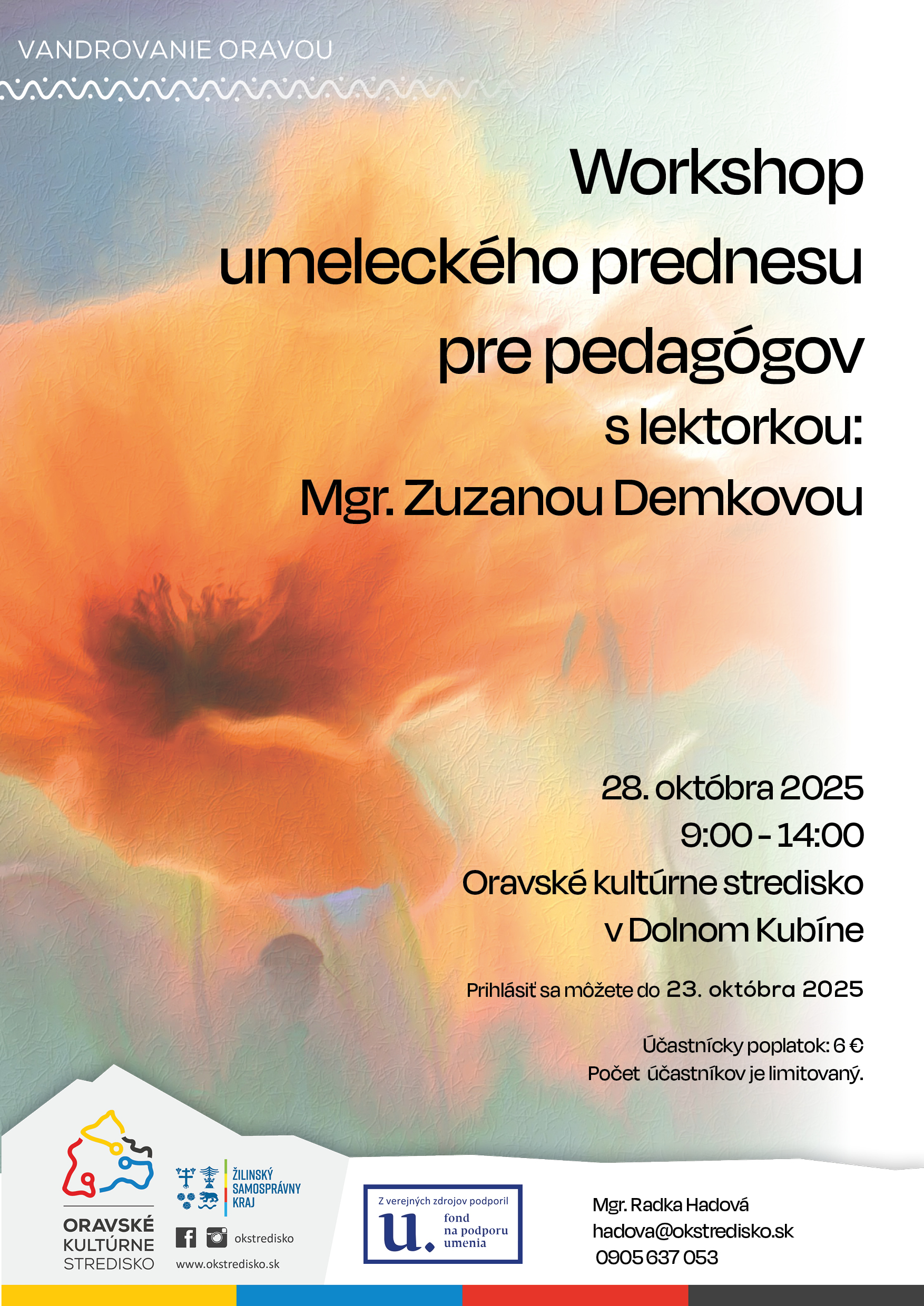 Tvorivý workshop umeleckého prednesu s lektorkou Mgr. Zuzanou Demkovou pre pedagógov a pedagogičky slovenského jazyka a literatúry so zameraním na prípravu a hodnotenie recitátorov a recitátoriek s praktickým i pragmatickým zameraním: ako pracovať s recitátormi od výberu textu, cez dramaturgiu, až po finálnu prácu s hlasom a prejavom recitátora s dôrazom na aktivity spojené s textovými ukážkami.